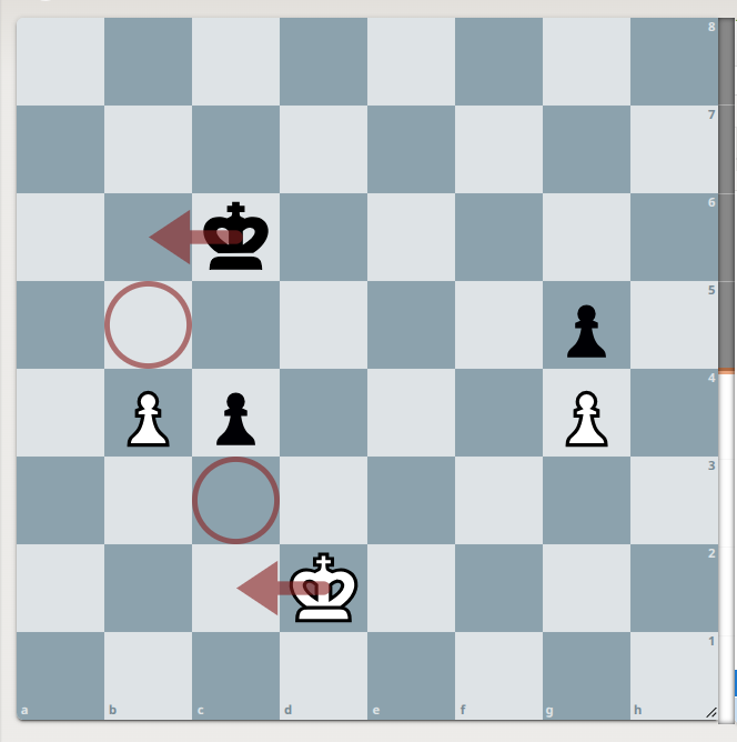Zum Trost hier ein Beispiel für verminte Felder – Kreise, die keiner Spieler zuerst betreten sollte. Die Könige bewegen sich Quer und warten. Betritt dennoch einer dieses Feld als Erster, dann zieht auch der Gegner auf sein (nun nichtmehr) vermintes Feld … und wohin jetzt? – weg vom Bauer = BOOM und Verlust der Partie.